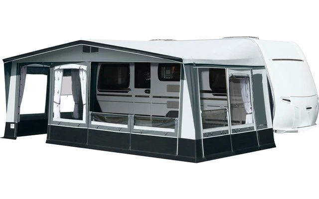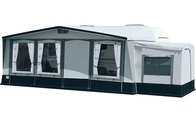 Das Brand Palazzo, bei diesem Saison- und Ganzjahres-Vorzeltmodell kommt für das Dach und die Seitenwände ein robustes Polychlorid-Material zum Einsatz. Die Vorderwand wird aus atmungsaktivem „Ten Cate“-Gewebe gefertigt. Frei wählbare Eingangsposition durch die Elementtechnik der Vorderwand. Für die Seitenwände gibt es insgesamt vier Fensterelemente: zwei Folienfenster und zwei Lüftungsfenster. Diese vier Elemente können nach Wunsch positioniert werden. Fensterklappen, Wetterschutzabdeckung der Reißverschlüsse, eine verschließbare Hochentlüftung und ein 28 mm Stahlrohrgestänge mit PowerGrip und Vordachverstärkung komplettieren die umfangreiche Serienausstattung.