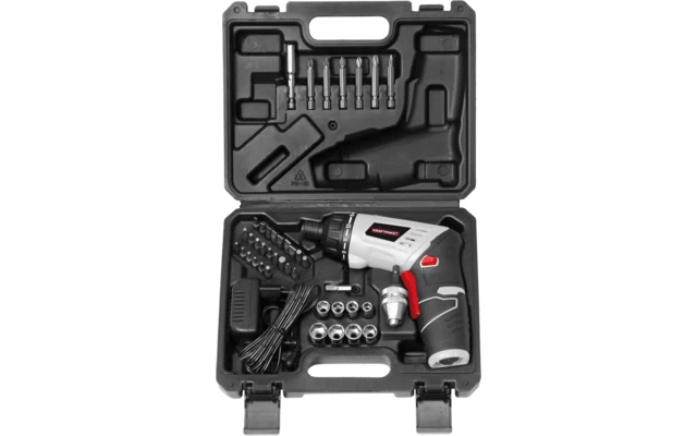 Das Dino KRAFTPAKET Multiplex-Akku-Schrauber-Set ist ein echter Allrounder und Alltagshelfer. Der kleine Akkuschrauber ist leicht, klein, handlich und mit dem drehbaren Gehäuse auch auf engstem Raum einsetzbar. Mit dem 41-teiligen Bitsatz, bestehend aus Torx-, Kreuz-, Schlitz-, Innensechskantbits, Stecknüssen, Bohrfutter, einem Netzteil und einem platzsparenden, verschließbaren Koffer, ist es das ideale Akku Werkzeug Set im Haushalt, für das Hobby und für die Reise.