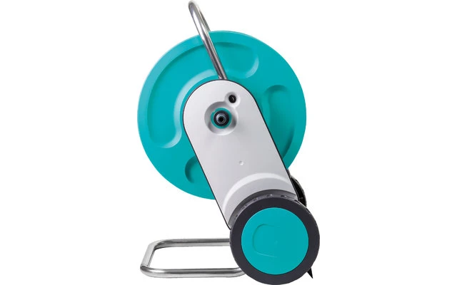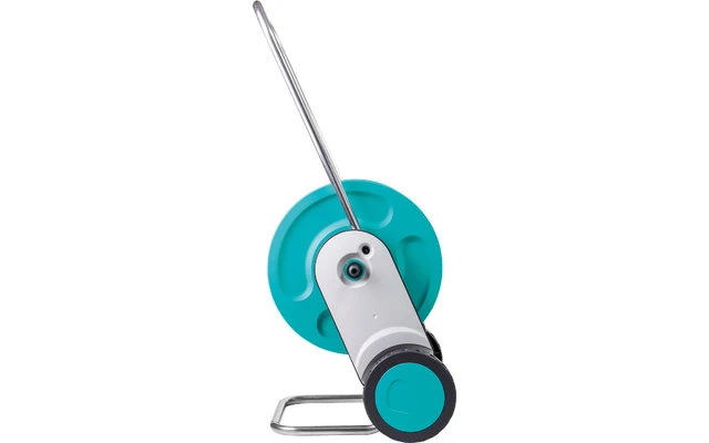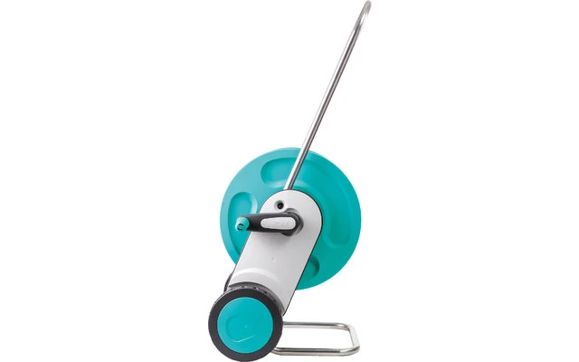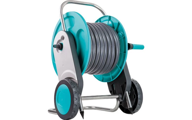 Schlauchwagen Komplettset aus Kunststoff und Metall „Ready-To-Use“ montiert und ausgestattet. Das innovative patentierte Anti-Kipp-System und der bereite Standbügel gewährleisten eine erhöhte Standsicherheit. Die einstellbare Schubgabel kann ganz einfach in den Boden gesteckt werden. Dies sorgt dafür, dass der Schlauchwagen nicht umkippt, wenn man z.B. am Schlauch zieht. Bequemer Transport und platzsparende Aufbewahrung sind durch den höhenverstellbaren Griff gewährleistet.