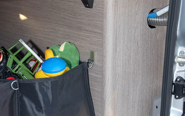 Das Multibehältnis kann liegend und auch stehend, als Aufbewahrungsack (ohne Boxen) benutzt werden. Bei Nichtgebrauch wird es platzsparend zusammengefaltet und verstaut. Entlang der Oberkante befinden sich mehrere Halbrundringe durch die Gummispanner geführt werden, welche an Wandhaken oder Loxx-Druckknöpfe eingehängt werden. Dekomaterial und Transportboxen gehören nicht zum Lieferumfang.
