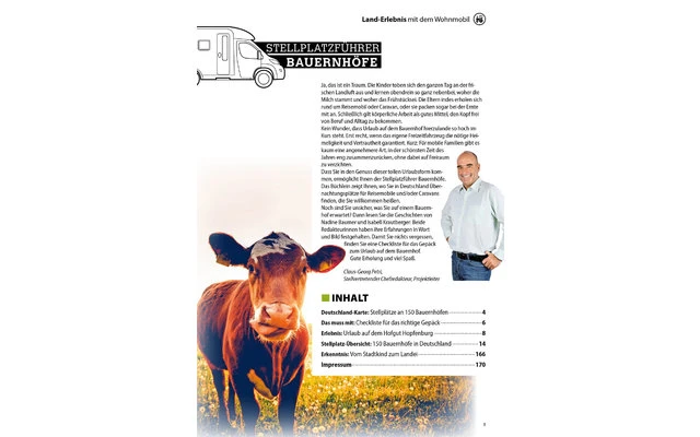 Ein idyllischer Familienurlaub auf dem Land! Ob Kühe melken oder bei der Ernte helfen – diese Erstauflage nennt Bauernhöfe in ganz Deutschland, die ihren Hof für Besucher öffnen und Aktivitäten bieten. Das jeweilige Freizeitangebot reicht vom Entspannen über die Hilfe im Stall bis zum Brotbackkurs. Es werden 150 Bauernhöfe aufgeführt, die direkt vor Ort oder in unmittelbarer Nähe einen Stellplatz für Reisemobil und/oder Caravans haben. Mit detaillierten Informationen zu den 150 Stellplätzen sowie einer Checkliste für das richtige Gepäck. Besonders erwähnt: Hofläden und ihr Sortiment.